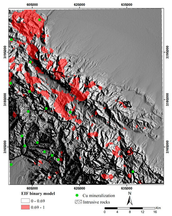 The comparison of the prospectivity models generated by the two unsupervised tree-based algorithms, IF and EIF (Figure 14), with the geological map of the study area (Figure 1) indicated that the anomalous zones identified by both methods are consistent with the andesitic units, tuffs, rhyolites, pyroclastic units, and intrusive rocks. Furthermore, these methods have suitably predicted many of the known mineral deposits in the region. Therefore, it can be inferred that both algorithms demonstrate a high level of effectiveness in identifying exploration targets associated with mineralization in the study area.
