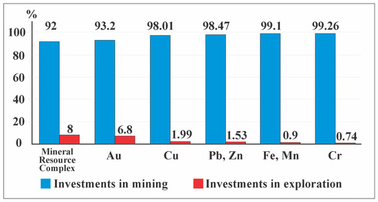 A histogram of the ratio of production and replenishment in accordance with the distribution of investment funds for production and geological exploration over the past 10–15 years.