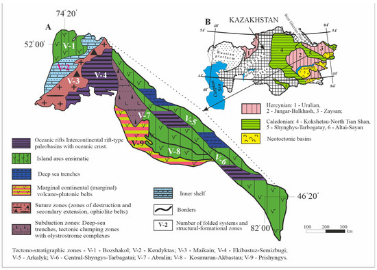 (A) Tectono-stratigraphic zoning scheme of the Shyngys-Tarbagatai folded system; (B) position of the Shyngys-Tarbagatai folded system within the Kazakh Paleozoic Orogen [4].