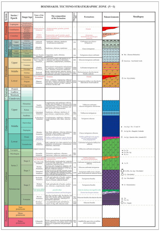Metallogenic diagram of the Bozshakol tectono-stratigraphic zone.