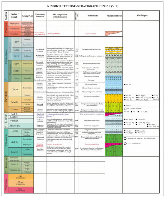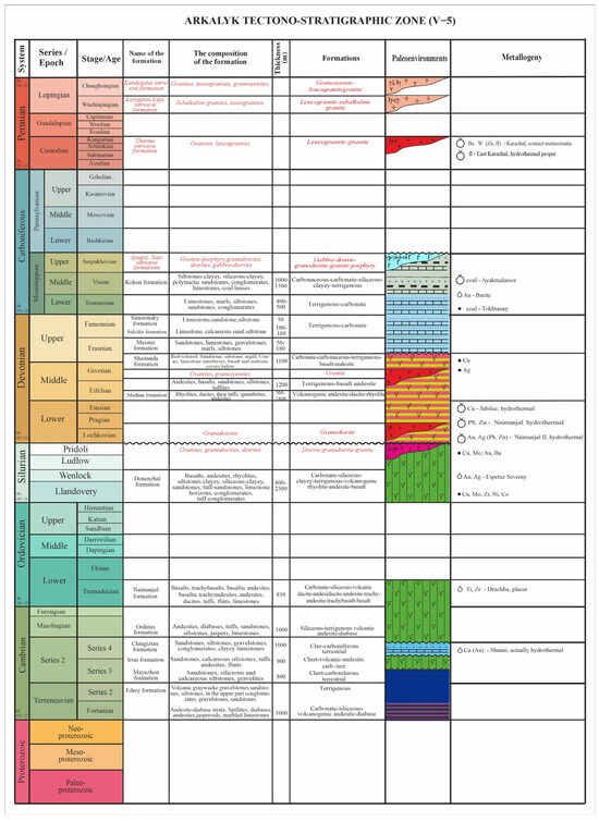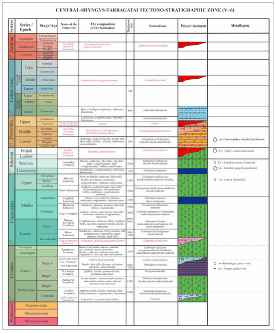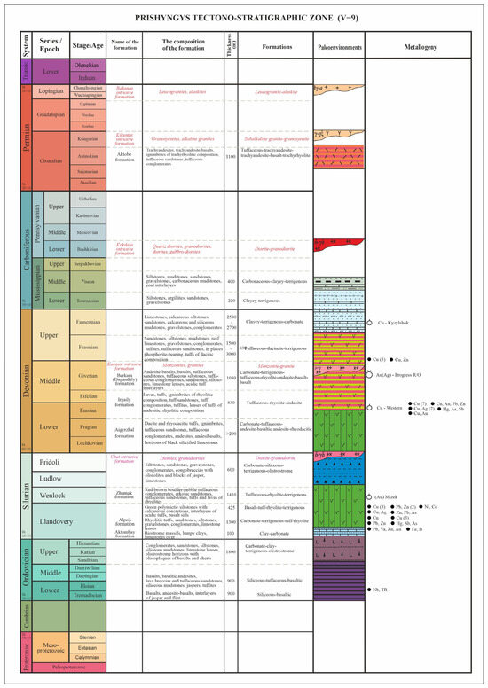 Metallogenic diagrams of nine tectono-stratigraphic zones within the Shyngys-Tarbagatai folded system, mapped during Paleozoic tectono-stratigraphic zoning in Kazakhstan [29], form the core of this study. Metallogenic diagrams are presented as tables detailing the geological and metallogenic characteristics of specific tectono-stratigraphic zones. These tables include lithological and chronological sequences of stratified and intrusive formations, columns classifying their formational types, vertical sequences representing paleoenvironmental conditions during formation, and columns indicating ore mineralization at various scales—from ore occurrences to small, medium, and large deposits—all linked to ore-hosting formations [30].