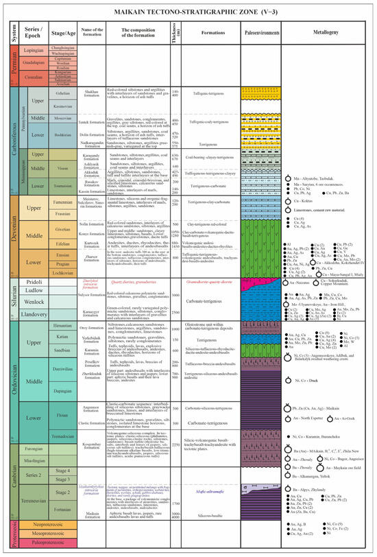 Metallogenic diagram of the Maikain tectono-stratigraphic zone.