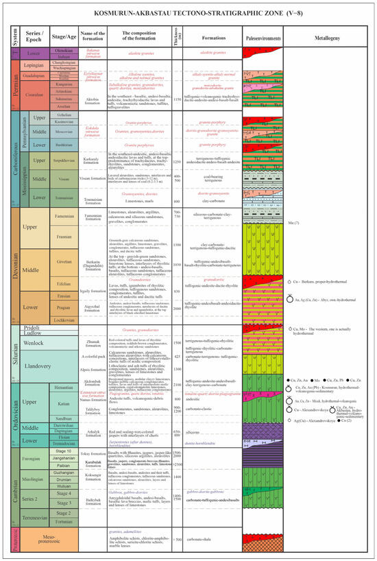 Metallogenic diagram of the Kosmurun–Akbastau tectono-stratigraphic zone.