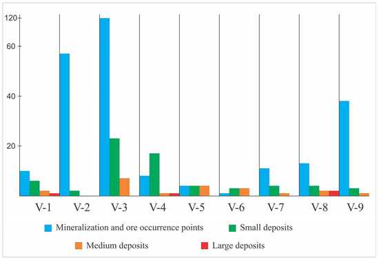 Distribution of ore occurrences of different ranks in the tectono-stratigraphic zones of the Shyngys-Tarbagatai folded system at the current level of ore potential study. Indexes of the SFZ: V-1—Bozshakol; V-2—Kindikti; V-3—Maikain; V-4—Ekibastuz–Semizbugy; V-5—Arkalyk; V-6—Central Shyngys; V-7—Abraly; V-8—Kosmurun–Akbastau; V-9—Prishyngys.