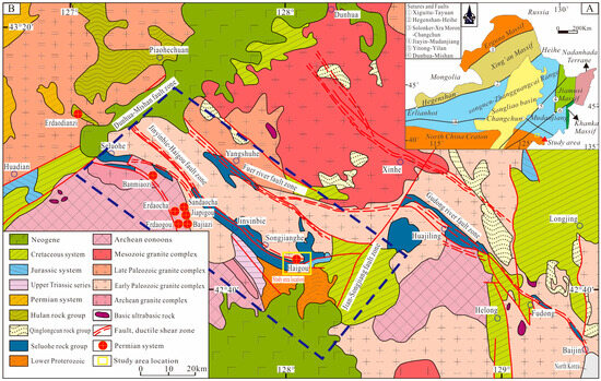(A) Simplified tectonic map of NE China (modified from Wu et al. [1]); (B) regional geological map of southeast Jilin Province (modified from Fan [7]).