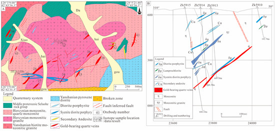 (A) Regional geological sketch map of the Haigou gold deposit (modified from Qiu [8]); (B) Profile map of exploration line from the Haigou gold deposit (modified from Qiu [8]).