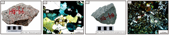 The LA-ICP-MS zircon U–Pb ages for monzonitic granite (HG-TW1) and pyroxene diorite porphyrite (HG-TW2) are listed in Table 2 and shown in Figure 5. All zircon grains from the monzonitic granite and pyroxene diorite porphyrite samples were euhedral–subhedral in shape and transparent and mostly displayed oscillatory growth zoning in CL images (Figure 5) and high Th/U ratios (0.16–1.21 > 0.1), indicating a magmatic origin [68,69,70].