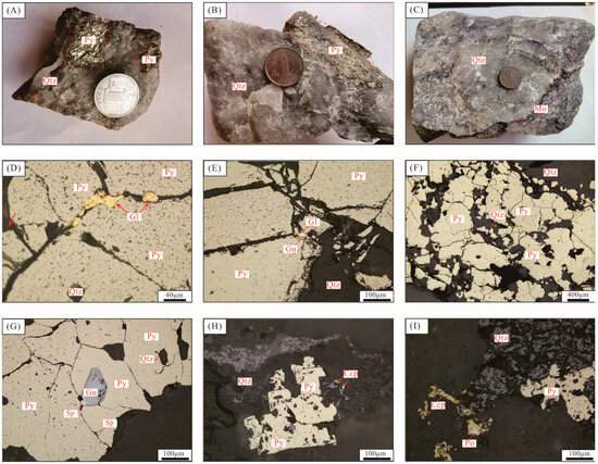 Representative photographs showing the texture and structure of the orebodies in the Haigou gold deposit. (A) Lumpy pyrite quartz vein, Medium coarse-grained idiomorphic pyrite; (B) Lumpy pyrite quartz vein, Fine-grained hemidiomorphic-heteromorphic pyrite; (C) Molybdenite quartz veins, Thin film molybdenite; (D) Gold-bearing pyrite quartz veins (reflected light); (E) Gold ore (reflected light); (F) Pyrite fossil quartz vein type ore with idiomorphic to semi-idiomorphic vein structure (reflected light); (G) Early galena by pyrite coating during the major stage of the vein-type mineralization(reflected light); (H) Pyrite replaced by galena during the major stage of the vein-type mineralization (reflected light); (I) Symbiosis of pyrrhotite, pyrite and chalcopyrite in vein-type mineralization(reflected light). Abbreviations: Gl: gold; Py: pyrite; Ccp: Chalcopyrite; Sp: sphalerite; Gn: galena; Po: pyrrhotite; Qtz: quartz.