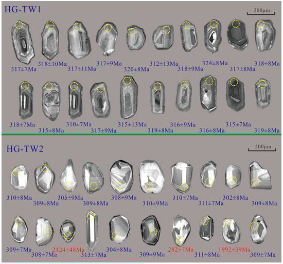 For sample HG-TW1, the 206Pb/238U ages of 22 analytical spots yield 206Pb/238U ages range from 310 ± 7 Ma to 324 ± 8 Ma, with a weighted mean age of 317.1 ± 3.5 Ma (MSWD = 0.12, N = 22; Figure 6). Except for three analytical spots showing 206Pb/238U ages of 1992 ± 39 Ma, 2124 ± 48 Ma, and 282 ± 7 Ma, the 206Pb/238U ages of 24 analytical spots from sample HG-TW2 vary from 302 ± 8 Ma to 313 ± 7 Ma, with the Concordia U–Pb age and weighted mean age of 309.2 ± 1.5 Ma and 308.8 ± 3.0 Ma (MSWD = 0.10, N = 24; Figure 6), respectively. Two older zircons (1992 ± 39 Ma and 2124 ± 48 Ma) from sample HG-TW2, combined with CL images of zircons, are interpreted as inherited or captured zircons entrained by the magma.