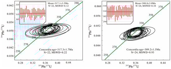 Zircon U-Pb isotope age determination was performed using an Agilent 7500A quadrupole inductively coupled plasma mass spectrometer (ICP-MS) from the United States in conjunction with a COMPExPro 193 nm ArF excimer laser. The beam spot diameter was set to 32 μm. For every six sample measurements, one standard zircon 91500 and one NIST610 were analyzed as external standards. Age calculations were corrected for isotope ratio fractionation using standard zircon 91500 as an external reference. Element concentration calculations utilized NIST610 as the external standard and silicon (Si) as the internal standard [61]. Errors in the isotope ratios and ages are reported at the 2σ confidence level. The detailed experimental procedure can be found in the relevant literature [62,63,64]. Correlation processing of the zircon isotope data was conducted using the Glitter 4.0 software. A common lead correction was performed using Anderson’s method [65], while Isoplot 3.0 was used to calculate the weighted average age of the zircons [66] and plot the zircon U-Pb age concordia curve (Figure 6).