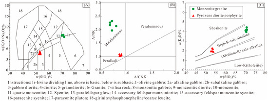 The whole-rock major and trace element concentrations of the monzonitic granite (HG-TW1) and pyroxene diorite porphyrite (HG-TW2) from the Haigou deposit are presented in Table 3. The monzonitic granite has high SiO2 (70.47–71.01 wt. %) and Na2O + K2O (9.74–10.17 wt.%) and contains Al2O3 content of 14.56–15.02 wt.%, TFe2O3 content of 1.08–1.93 wt.%, CaO content of 1.35–1.89 wt.%, TiO2 content of 0.11–0.15 wt.%, and MgO content of 0.17–0.33 wt.%, with Mg# [Mg# = 100 × Mg2+/(Mg2+ + TFe2+)] values varying from 9 to 19. Compared with monzonitic granite, pyroxene diorite porphyrite has relatively lower SiO2 ratios, ranging from 52.90 to 54.09 wt.%, Na2O + K2O varying from 4.55 to 5.28 wt.%, but relatively higher Al2O3 (14.54–15.30 wt.%), TFe2O3 (7.29–7.75 wt.%), CaO (6.63–8.32 wt.%), TiO2 (0.56–0.60 wt.%) and similar MgO (8.13–9.27 wt.%), with higher Mg# values ranging from 49 to 51. Their A/CNK ratios vary from 0.88 to 0.91 and range from 0.69 to 0.81, and A/NK ratios vary from 1.03 to 1.09 and range from 1.98 to 2.33, respectively, indicative of metaluminous rocks. In the w(SiO2) % vs. w(Na2O + K2O) % diagram (Figure 7A), monzonitic granites are divided into alkaline series and pyroxene diorite porphyrite samples are divided into subalkaline series, mainly located in the granite and gabbro diorite regions, respectively. This is consistent with the characteristics identified under a microscope. On the A/CNK vs. A/NK diagram (Figure 7B), they all fall into the metaluminous region, and in the SiO2 vs. K2O diagrams (Figure 7C), they all fall into the high-K calc-alkaline series field.