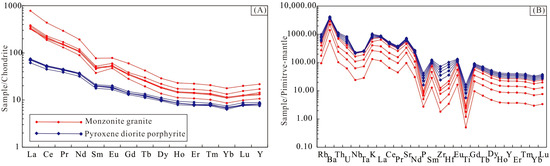 (A) Chondrite-normalized rare earth element (REE) patterns and (B) primitive mantle-normalized geochemical patterns for the rhyolite and dacite from the Haigou deposit. Chondrite and primitive mantle values are from Boynton [74] and Sun and McDinough [75], respectively.