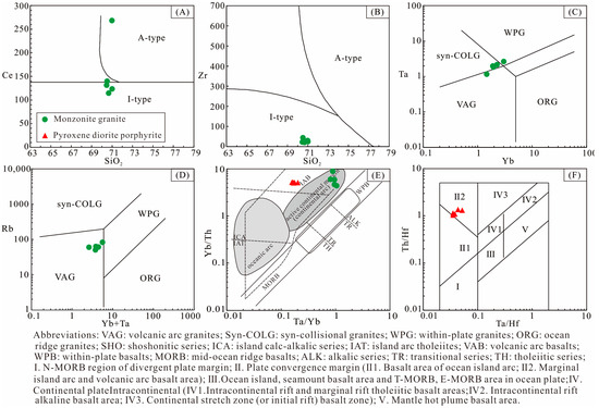 (A) SiO2 vs. Ce diagram (modified from Collins et al. [78]); (B) SiO2 vs. Zr diagram (modified from Collins et al. [78]); (C) Yb vs. Ta diagram (modified from Pearce et al. [79]); (D) Yb + Ta vs. Rb diagram (modified from Pearce et al. [79]); (E) Ta/Yb vs. Th/Yb diagram (modified from Pearce et al. [80]); (F) Ta/Hf vs. Th/Hf (modified from Wang et al. [81]).