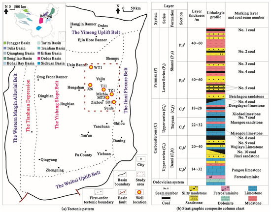 The study area is located in the eastern central part of the Ordos Basin. The Ordos Basin spans five provinces of Nei Mongol, Shaanxi, Gansu, Ningxia, and Shanxi, with a total area of about 37 × 104 km2, and has experienced multiple phases of tectonic evolution, which is a typical multi-rotation, composite basin [29]. The Late Carboniferous–Permian formed an extensive marine–continental interaction type of coal-bearing measures. At the end of the Early Triassic, the Ordos Massif rose in the east and fell in the west, after which Triassic and Jurassic terrestrial coal-bearing measures were deposited. As a result, the basin is endowed with widely distributed Carboniferous–Permian marine–continental interbedded coal strata and Triassic and Jurassic continental coal strata. The Ordos Basin can be divided into six tectonic units: the Western Margin Alluvial Belt, the Tianhuan Depression, the Weibei Uplift Belt, the Yishang Slope Belt, the Yimeng Uplift Belt, and the Jinxi Flexure Belt (Figure 1a) [30]. The coal seams are mainly distributed in the Yishang slope and the Tianhuan Depression in the west.