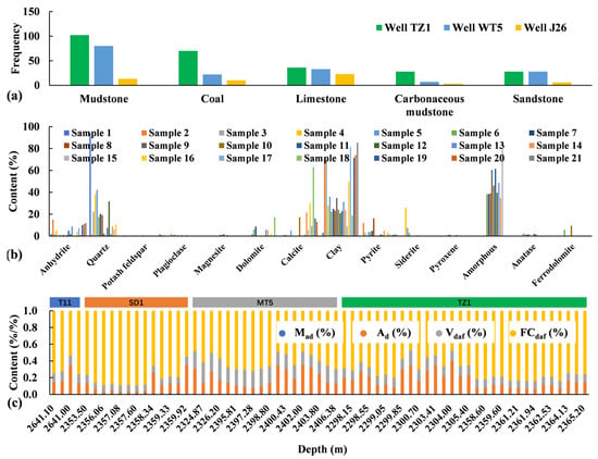 Experimental analysis of lithology, mineral, and proximate analysis components. (a) Lithology statistics (b) Mineral types and contents; (c) Proximate analysis components analysis.