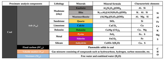 where and are the ash content before and after normalization (%); and are the fixed carbon content before and after normalization (%); and are the volatile matter content before and after normalization (%); and are the moisture content before and after normalization (%); is the content of each mineral component in coal seam (%), where n = 1, 2, 3, 4, 5, 6, 7, 8, 9 represent kaolinite, montmorillonite, illite, quartz, calcite, dolomite, pyrite, siderite and anhydrite, respectively; and is the mineral content calculated by Formula (6) (%).