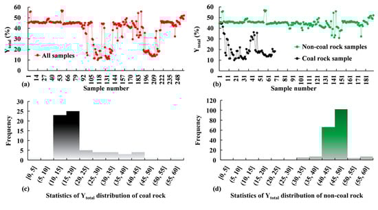 distribution of all samples; (b) The distribution of coal-rock and non-coal rock respectively; (c) distribution statistics of coal rock (d) distribution statistics of non-coal rocks.