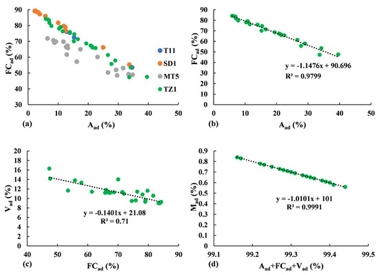 Regression calculation model between proximate analysis components. (a) The correlation between Aad and FCad; (b) The regression model between Aad and FCad; (c) The regression model between FCad and Vad; (d) The regression model between Aad + FCad + Vad and Mad.