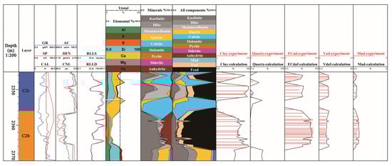 After classifying coal and non-coal seams, traditional algorithms can be used to calculate the mineral content (percentage of ash in coal) of the non-coal seams. Based on the elemental content to calculate the mineral matter content, the most commonly used method is the oxide closure model [33]. The basic principle of the oxide closure model is to set the sum of the weight percentages of the oxides of all elements per unit volume of the stratum as 100%. Through the oxide closure model, the weight percentage of each element can be determined (Equations (3)–(5)), and then the content of each mineral can be calculated by solving the Herron matrix (Equation (6)) [34].
