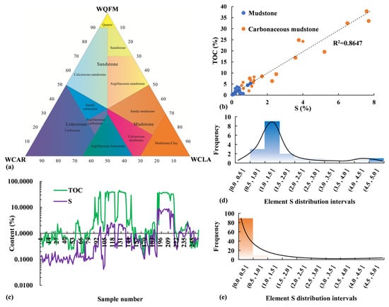 The triangular diagram of the clastic rock method can only distinguish mudstone. Still, mudstone also includes carbonaceous mudstone, which mainly refers to the lithology between ordinary mudstone and coal seam in the coal-bearing measures. According to China’s evaluation standard for coal hydrocarbon source rock, those with TOC less than 6% are usually considered as mudstone, those with TOC between 6% and 40% are carbonaceous mudstone, and those with TOC more than 40% are coal seams (SY/T 5735-2019) [37]. However, because TOC data are scarce and unavailable for every well, there are significant limitations in classifying carbonaceous mudstone based on TOC. This study found that the S (sulfur) element strongly correlates with TOC (Figure 8b,c), so it is possible to further classify ordinary mudstone and carbonaceous mudstone based on S content. Based on the lithological statistics and the distribution interval of S element content, the S element content of carbonaceous mudstones is mainly greater than 1% (Figure 8d). In comparison, mudstones are less than 1% (Figure 8e), so mudstones with S element greater than or equal to 1 in mudstones in the study area are classified as carbonaceous mudstones in this paper (Equation (24)).