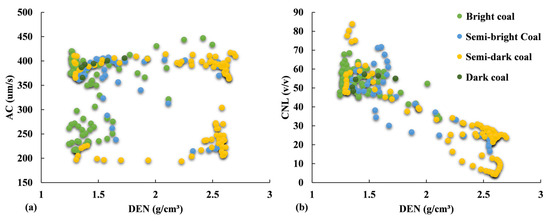 Coals must be classified into four macroscopic coal lithotypes: bright coal, semi-bright coal, semi-dark coal, and dark coal. Macroscopic coal types are categorized based on the brightness of the coal and its vitrinite content (GB/T 18023-2000) [38]. In bright coal, the bright component content (vitrain and clarain) is greater than 80%, and the vitrinite content is more than 80%. The bright component of semi-bright coal is 50%~80%, and the vitrinite content is 60%~80%. The bright component of semi-dark coal is 20%~50%, and the vitrinite content is 35%~60%. The bright component of dark coal is less than 20%, and the vitrinite content is less than 35% [39]. The traditional methods for classifying macroscopic coal lithotypes are usually based on three conventional logging curves: AC, DEN, and CNL. However, through statistical analysis, it is found that there are complex overlapping relationships between these three curves and macroscopic coal lithotypes. Therefore, it is rather challenging to identify macroscopic coal lithotypes based on conventional curves, and it is impossible to achieve this (Figure 9).