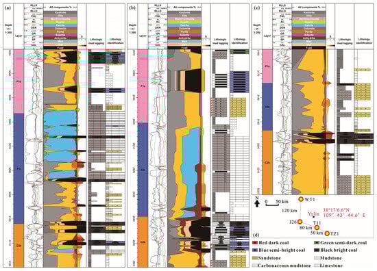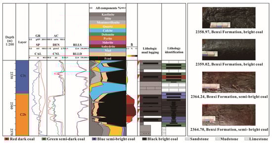 China has very rich coalbed methane (CBM) resources. The global proven reserves of CBM resources are about 270 × 1012 m3, mainly distributed in Russia, Canada, China, and the United States [1,2]. China’s CBM reserves are about 70 × 1012 m3, accounting for about 26% of the global total [3,4]. At present, China’s CBM exploration and development are relatively concentrated, mainly in the Ordos Basin [5,6]. Continuously building “high efficiency and high precision engineering tools” for exploration and development is the key to realizing the large-scale and efficient development of CBM [7]. Compared with shale oil and gas and tight gas [8,9,10], the industrial scale of CBM is still in its infancy, and constructing demonstration zones and large-scale cost-effective exploration and development still faces significant technical challenges [11,12,13]. Therefore, adaptive technologies are urgently needed. Among them, accurate calculation of rock components of coal-bearing stratum, lithology identification, and macroscopic coal lithotypes delineation and identification are the essential bases for the evaluation of CBM geological engineering [14,15,16].