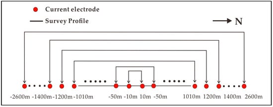 The nonconventional gradient array protocol for the SSIP survey profile, utilizing 34 current electrodes with a maximum spacing of 5200 m and a minimum spacing of 20 m. The 2000 m line features potential electrodes spaced 20 m apart, modified based on Liu et al. (2017) [21].