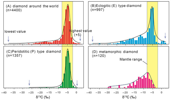 Carbon isotopic composition (δ13C) of diamond, data modified from [15]. Modified after Cartigny [15].