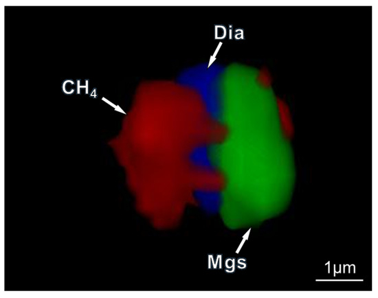 Three-dimensional multiphase inclusions of diamond (blue), CH4 (red), and magnesite (green) in olivine from Dabie organic belt, data from Wang et al. [33]. Dia stands for diamond, CH4 stands for methane, and Mgs stands for magnesite.