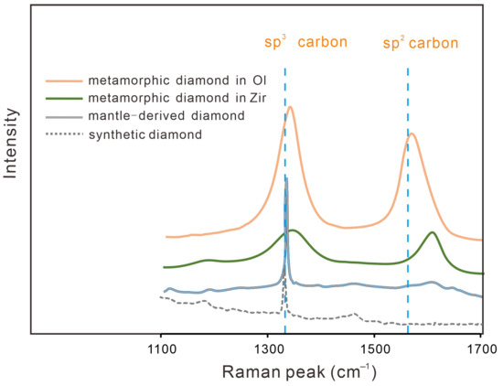 In addition, an important observation by Barron et al. [44] shows that sp2-disordered carbon, characterized by a Raman peak at 1580 cm−1, is distinguished in metamorphic diamond. Experimental petrological studies have further verified that hydrogen in diamond-forming medium is preferentially incorporated into cubic diamonds, donating an electron [49]. This process causes cubic diamonds containing both sp3-ordered carbon and sp2-disordered carbon, whereas octahedral diamond only has sp3-ordered carbon. Thus, Raman spectroscopic analyses show that diamond inclusions trapped in olivine primarily consist of sp3-ordered carbon (1332 cm−1 peak), with additional peaks at 1340 cm−1 and 1580 cm−1 for disordered carbon [3,84] (Figure 3). H- groups on the carbon surface serve as terminal bonds, promoting the transformation of sp2 to sp3 carbon during diamond growth, which is significantly different from mantle-derived diamond.