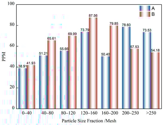 Figure 2 displays the Li distributions across the particle size fractions in samples A and B, which exhibited non-monotonic Li enrichment patterns: as the particle size decreased from 80–120 to >250 mesh, the Li content initially rose until it peaked at intermediate sizes (120–200 mesh) before declining. Notably, sample A achieved a maximum Li concentration (78.60 ppm) at 200–250 mesh, while sample B showed peak enrichment (87.56 ppm) at 120–160 mesh. This size-dependent enrichment behavior highlights the optimal particle range (120–250 mesh) for Li recovery.