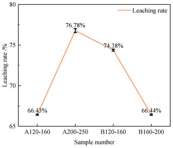 The acid-leaching experiments were conducted on four pre-concentrated samples: A120–160, A200–250, B120–160, and B160–200. Table 1 presents the Li content in the raw ore samples before and after the acid leaching. The post-leaching Li concentrations exhibited significant depletion compared with the pretreatment values, which confirmed effective lithium mobilization. These results highlight the potential for enhancing the leaching efficiency through process parameter optimization. Figure 3 illustrates the Li leaching rates across samples, revealing substantial variability (66%–77%). Specifically, sample A200–250 achieved the maximum leaching rate (77%), while sample B160–200 showed the lowest efficiency (66%). This size- and sample-type-dependent leaching behavior underscored the critical roles of particle characteristics. Notably, cross-referencing Table 1 revealed a counterintuitive relationship: despite A200–250’s superior leaching rate, its extraction yield was less than B120–160’s. This necessitated the dual optimization of the leaching efficiency and mass transfer dynamics in the process design. It is generally recognized that smaller particle sizes correspond to larger specific surface areas, exposing more surface area to the leaching medium and thereby promoting element dissolution. Additionally, a reduced particle size shortens the diffusion path from the particle interior to the surface, minimizing the diffusion resistance. However, this conclusion only considers the direct impact of particle size on leaching while overlooking the influence of mineralogical properties. Variations in the element occurrence states also significantly affect the leaching efficiency. The higher leaching rate observed in B120–160 compared with B160–200 may be attributed to two factors: B120–160 contained more lithium, predominantly in easily leachable forms; for sample B, finer particles are more susceptible to passivation effects—smaller specific surface areas slow the reaction interface renewal, facilitating passivation layer formation.