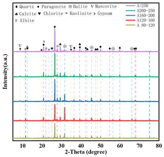 The XRD analysis results of the particle size fractions in samples A and B (Figure 4 and Figure 5) demonstrate that both samples predominantly comprised quartz, albite, and mica assemblages with accessory calcite, halite, chlorite, and kaolinite, though no discrete lithium-bearing minerals were detected. The ICP-OES correlation suggests that Li+ ions were adsorbed within phyllosilicate interlayers via ion-exchange mechanisms. Quartz exhibited persistent high-intensity diffraction peaks across all particle sizes, which confirmed its structural stability as the dominant phase. Albite displayed significant size-dependent crystallinity variations: sample A’s fine fractions (>250 mesh) showed higher peak intensities than the coarse fractions, whereas sample B’s intensities were lower than A’s counterparts, which reflected divergent mineral sorting efficiencies. Mica and calcite exhibited fine-fraction (>250 μm) enrichment with progressive peak attenuation as the particle size increased—sample A’s fine-grained calcite peaks were stronger than for the coarse grains. The halite distributions differed markedly: the mid-fraction enrichment (120–200 mesh) in sample A contrasted with the coarse-fraction dominance (>160 mesh) in sample B. Chlorite and kaolinite preferentially concentrated in the mid-fine fractions (160–250 mesh), where their characteristic peaks intensified compared with the coarse fractions. A comparative analysis revealed analogous mineral distribution patterns but distinct compositional disparities: the albite content in sample A exceeded that in sample B, and sample B’s fine-fraction feldspar peaks (B > 250, B250–200) remained weaker than A’s equivalents, indicating texture-dependent crystallinity degradation.