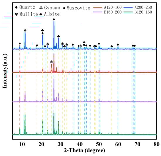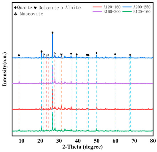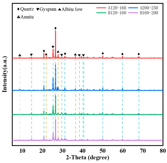 Post-roasting, the mineral compositions underwent further phase transformations across the particle size fractions. The XRD patterns of roasted products (Figure 7) reveal the following: quartz retention: stable diffraction peaks confirmed thermal resilience; feldspar persistence: reduced peak intensities suggest partial melting/phase transition; muscovite attenuation: weakened peaks indicate dehydration/lattice reorganization; and accessory mineral depletion: halite, calcite, chlorite, kaolinite, and gypsum exhibited peak attenuation or disappearance. Figure 8 demonstrates the mineral phase distribution across the various size fractions following the roasting–acid-leaching treatment. The quartz characteristic peaks persisted across all the samples but displayed a notably higher intensity in sample A. Concurrently, distinct gypsum diffraction peaks emerged, which confirmed the post-treatment gypsum formation. The mineral assemblage underwent significant transformations: the dolomite phases completely disappeared while new biotite phases formed. However, albite variants maintained a stable presence, as evidenced by their persistent diffraction signatures. Notably, compared with the solely roasted samples, this combined process achieved complete carbonate dissolution and exhibited mica formation patterns that showed a comparable phase evolution to standard acid-leaching outcomes.