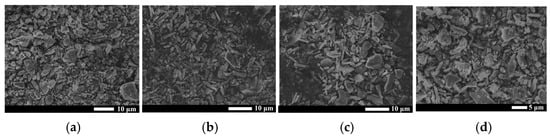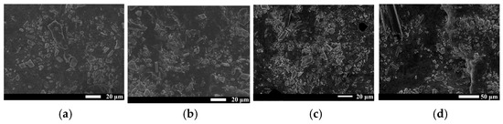 Figure 15 displays the SEM microstructural evolution of the roasted–acid-leached specimens. A comparative analysis with the roasted-only samples revealed enhanced surface porosity and localized acid-etched signatures, which demonstrated the acid treatment’s selective dissolution efficacy on the roasted matrices. Contrastingly, the unroasted acid residues exhibited superior structural porosity and reactivity, whereas the roasted–leached specimens displayed structural densification with diminished reactive interfaces. The mineralogical complexity and phase consolidation during the roasting impeded the lithium liberation through acid solution permeation barriers. Additionally, the rod-shaped crystalline phases and calcium sulfate deposits showed marked depletion.