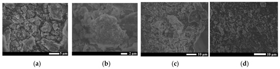 SEM images of the roasted–acid-leached samples. ((a): A120–160; (b): A200–250; (c): B120–160; (d): B160–200).