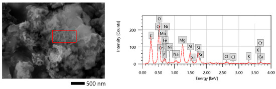 SEM-EDS images of agglomerates in the roasted residue. (The energy spectrum analysis corresponding to the red box on the left agglomerate is shown in the right figure.)