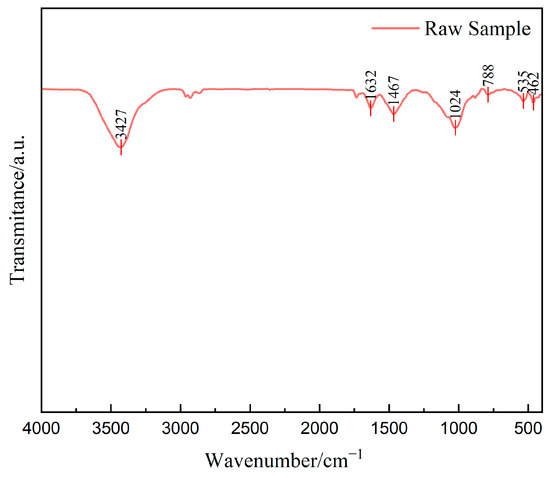 Within the 3750–3250 cm−1 spectral range, the broad band at 3427 cm−1 in the raw ore corresponded to O-H stretching vibrations of adsorbed water and clay mineral hydroxyl groups, which confirmed the presence of bound water and hydroxyl species. The O-H peak at 3435 cm−1 in the roasted samples exhibited a blue-shifted position and reduced intensity, indicating the partial removal of adsorbed water/hydroxyls while retaining thermally stable hydroxyl residues. The roasting–acid-leached specimens displayed sharp narrow peaks at 3609/3554 cm−1, which was tentatively assigned to neo-formed crystalline water or coordinated hydroxyl groups, with residual adsorbed water at 3428 cm−1. The acid-leached samples demonstrated the simultaneous presence of free hydroxyl groups (3542 cm−1) and adsorbed water (3407 cm−1). The acid leaching further modified the hydroxyl environments, which potentially facilitated the lithium liberation from the layered structures.