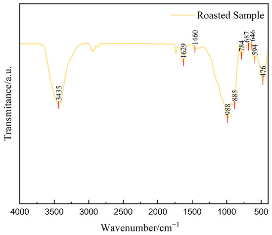 The FTIR analysis of the optimal sample B120–160 revealed characteristic absorption bands predominantly distributed across four spectral regions: 3750–3250, 1750–1500, and 1250–500 cm−1 (Figure 16). Figure 17, Figure 18, Figure 19 and Figure 20 present the infrared spectra of the B120–160 raw sample, roasted product, acid-leached residue, and roasting–acid-leached specimen, respectively.