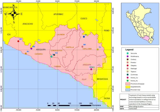 The study area is located in the Arequipa region, southern Peru. Sampling points were selected based on the Initial Inventory of Mining Environmental Liabilities of Peru [11], updated in 2018. Components classified as mining waste, specifically the “tailings” subtype, were filtered from the database, identifying 16 environmental liabilities in the region. Access authorization was obtained for six sites, distributed across the provinces of Arequipa, Caravelí, Camaná, Castilla, and Caylloma.