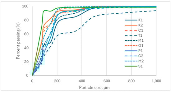 The particle size distribution of the mine tailings was assessed without additional grinding to preserve the original textural characteristics. In general, a substantial fraction of the material consisted of fine particles <200 µm, exceeding 40% in 4 out of the 10 samples. For example, as shown in Table 2, sample S1 contained 69.11% of fine particles (<75 µm), while samples C1 and O1 reached 48.76% and 49.67%, respectively. In contrast, samples such as K1, P1, and T1 showed lower fines content, with values below 30%. This type of distribution is relevant in the context of toxic metal mobility and retention, since finer particles—with their higher specific surface area—tend to adsorb and retain metals such as Hg, Pb, As, Cd, and Zn, potentially enhancing their release into the environment under certain physicochemical conditions [35,36].