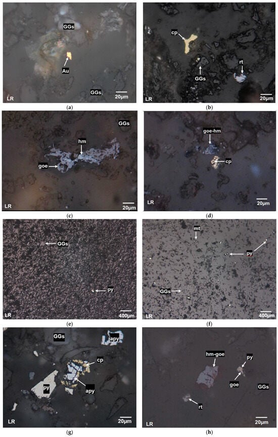 Samples C1 (Figure 4c), T1 (Figure 4d), and C2 (Figure 4h) show evidence of supergene oxidation. In C1, free grains of goethite (Gt), hematite (Hm), and gangue (Ga) are observed as typical alteration products of pyrite (Py) under strongly oxidizing conditions [16]. In T1, the lateral intergrowth of goethite (Gt) and hematite (Hm), along with free chalcopyrite (Cp), suggests a transitional zone between oxidized and sulfide facies. In C2, hematite (Hm) with inclusions of goethite (Gt), pyrite (Py) laterally associated with goethite (Gt), and liberated grains of rutile (Ru) and gangue (Ga) reflect a variable geochemical environment, characterized by partial oxidation and localized mineral preservation [42].