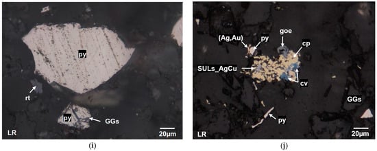Samples P1 (Figure 4g) and S1 (Figure 4j) represent the most complex metallogenic environments. In P1, arsenopyrite (Apy) is observed as inclusions within chalcopyrite (Cp), along with free grains of pyrite (Py) and arsenopyrite (Apy), indicating sequential crystallization and low alteration. Secondary sulfides such as covellite (Cv) and gray copper (Gc) are also present, consistent with an evolved mineralized system. In S1, intergrowths of pyrite (Py) with a solid solution of silver and gold (Ag, Au) are observed, together with Cp, inclusions of silver–copper sulfides (SULs_AgCu), covellite (Cv), and goethite (Gt) rims. This assemblage reveals a hydrothermal system enriched with precious metals and transitioning toward oxidizing conditions, where goethite (Gt) forms as a secondary product on the margins of sulfides [3].