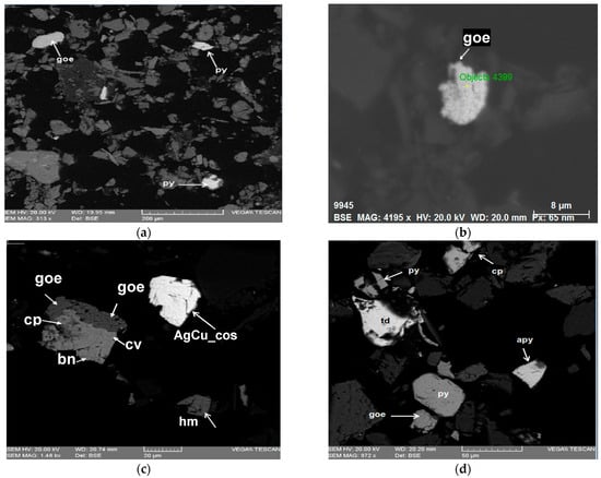 EDS analysis was carried out using a scanning electron microscope (Tescan Vega II and Vega IV) equipped with an energy-dispersive X-ray spectroscopy (EDS). The detection limit was 0.1 wt% (1000 ppm), in accordance with ASTM E1508-12a (2019) [29]. This procedure enabled the identification of mineral phases associated with economically and environmentally relevant elements such as gold (Au), silver (Ag), copper (Cu), lead (Pb), zinc (Zn), arsenic (As), mercury (Hg), and uranium (U) [15,30].