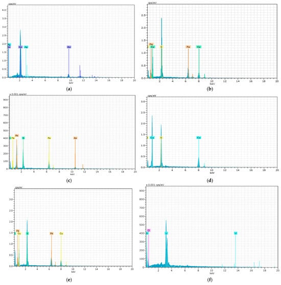 Figure 7. EDS spectra of various minerals in environmental tailings. (a) native gold (K1), (b) chalcopyrite (K2), (c) arsenopyrite (C1), (d) covellite (T1), (e) chalcopyrite (M1), (f) uraninite (O1).