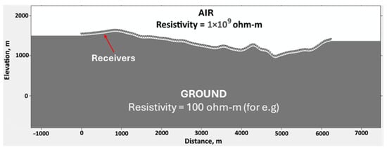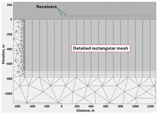 The automated process for mesh generation begins by considering a 100 km × 100 km bounding box model. The extents of this bounding box can be adjusted as required. The algorithm takes the length of a survey line and the topographic surface along the line as input. To avoid or at least reduce possible artifacts on the line’s ends (so-called “edge effect”), the area of interest is then defined by extending this line by a user-specified value (e.g., 500 m) at both ends. To define the bottom of the bounding box, the lowest elevation along the line is considered, and the bottom of the bounding box is calculated as the lowest elevation plus the user-defined depth of the model. The top of the region of interest box is defined by the topographic surface for the survey line. The area of interest is triangulated using external calls to the open-source constrained and conforming Delaunay triangulation code Triangle, as described in []. The user-specified maximum triangle length defines the resolution of the detailed mesh, while the surrounding pad area is meshed with arbitrarily large triangles. With some manipulation of the files, the *.resistivity and *.poly files required for input to MARE2DEM can be produced without any user involvement, except for specifying the mesh parameters or for preparing constrained inversions. Additionally, an algorithm has been developed to generate rectangular meshes automatically. It operates similarly to the previously described method but uses a rectangular mesh instead of a triangular one in the region of interest. The rectangles have user-specified height and width (Figure 3). This approach is suitable only when the terrain can reasonably be approximated as flat.