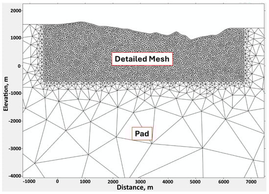 Configuration of triangular mesh for input to inversions. The detailed mesh is located below the survey line, and the pad mesh extends to the edge of the model’s bounding box.