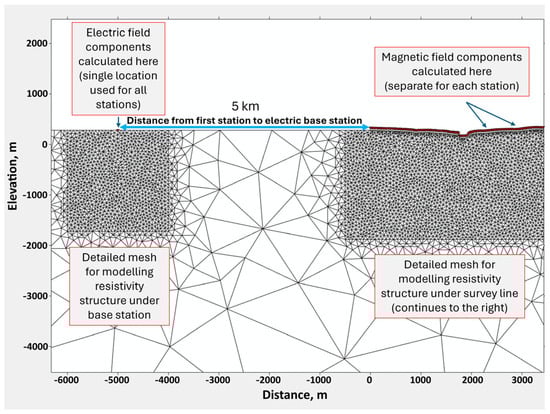 To account for the E-field base station separation from survey H-field measurements during modeling, a smaller box with a detailed mesh is created a distance away from the survey line (Figure 4). In the inversion, MARE2DEM’s hybrid station capability allows magnetic fields from the flight line and electric fields from an offset base station to be jointly modeled within a mesh containing both locations. This allows the separate and distinct resistivity structure under the stationary base station and the survey line to be considered in the modeling.