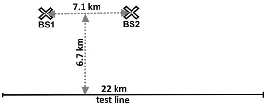 Schematic diagram showing the test line and the locations of the two base stations (BS1 and BS2). Distances between key points and along the test line are indicated.