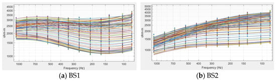 Apparent resistivity curves calculated along the test survey line using base stations BS1 (a) and BS2 (b). Set of frequencies: 84, 103, 138, 165, 209, 267, 339, 420, 533, 676, 844, and 1067 Hz.